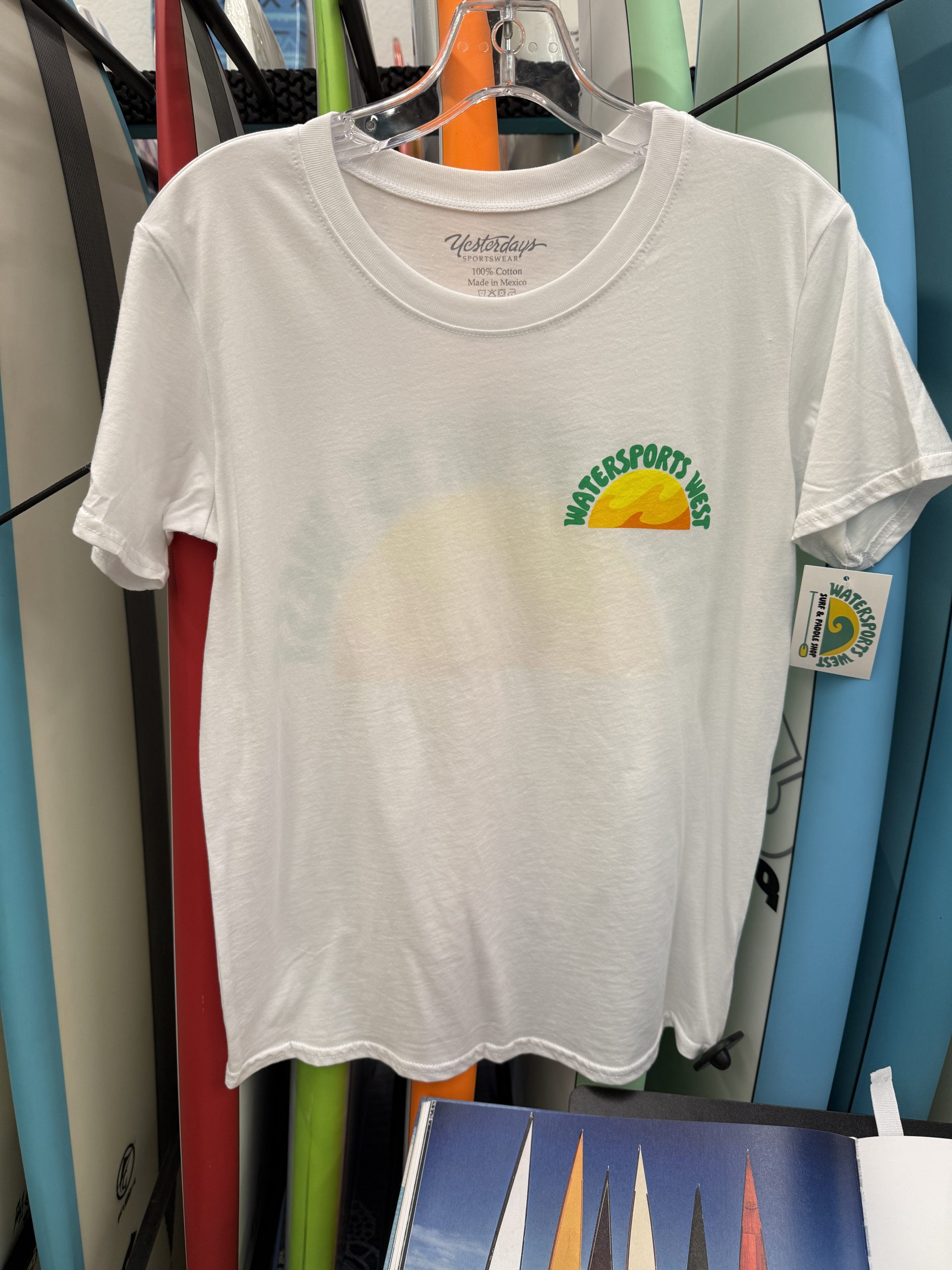 Watersports West x Yesterday’s Groovy Sun Women’s Tee. Women’s White Surf Tee. Available in Small, Medium, Large, XL, and XXL.