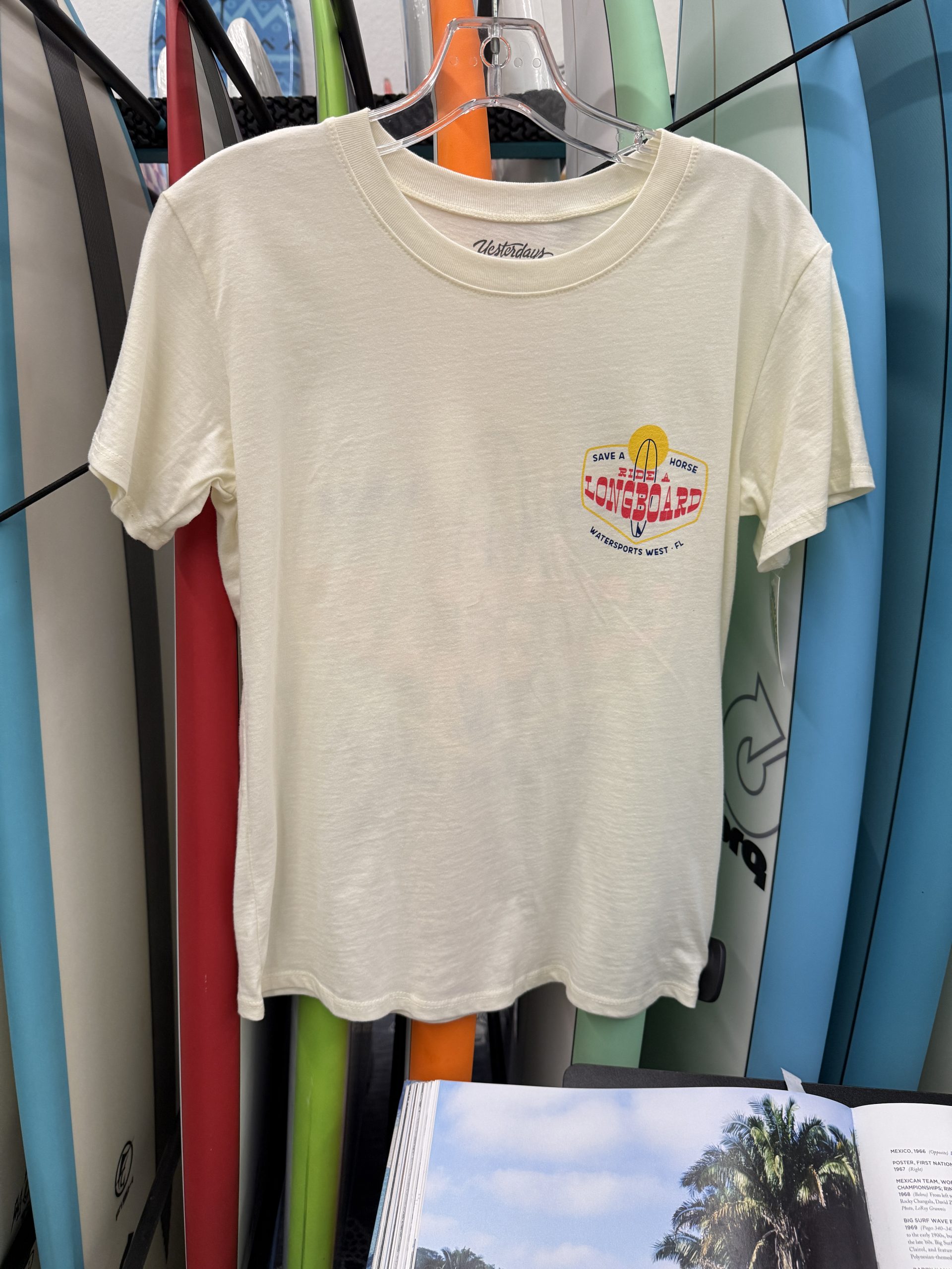 Watersports West X Yesterday’s Longrider Tee. Women’s Ivory Surf Tee. Available Sizes: Small, Medium, Large, XL, XXL.