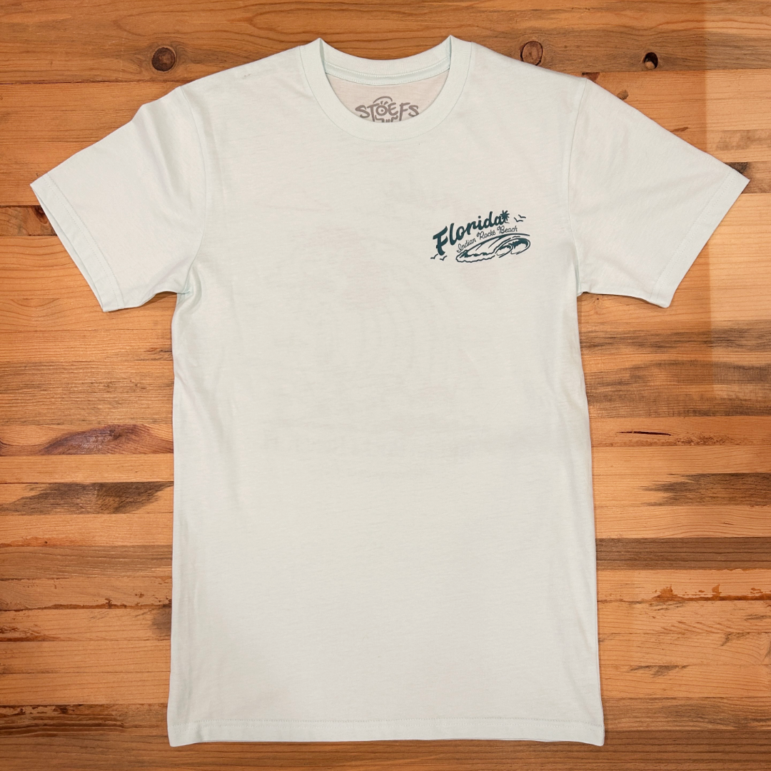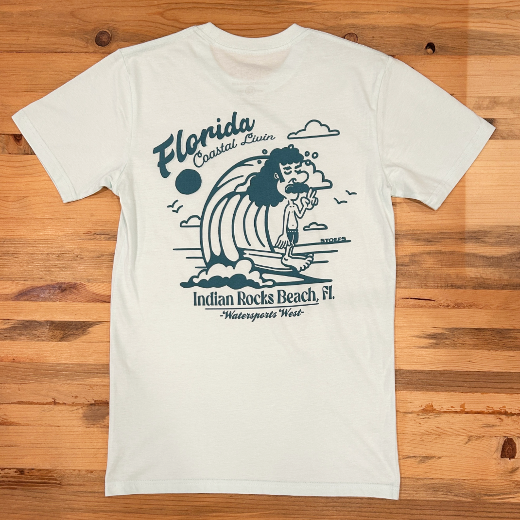 Watersports West x Stoefs Take it Easy Men’s Tee. Men’s Seafoam Surf Tee Shirt. Comes in Small, Medium, Large Extra-Large, XXL, and XXXL.