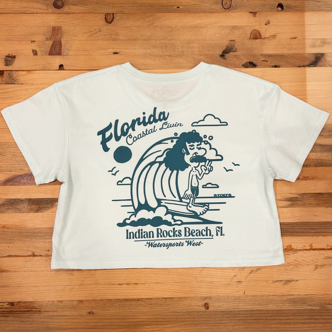 Watersports West x Stoefs Take it easy Women’s Cropped Tee. Women’s Seafoam Surf Tee Shirt. Comes in Extra-Small, Small, Medium, Large.